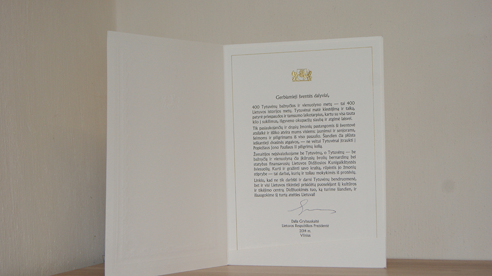 Po Šv. Mišių vyskupas Šiaulių vyskupijos kurijos kancleris Evaldas Alūza perskaitė LR Prezidentės Dalios Grybauskaitės sveikinimo žodžius jubiliejaus proga. ,,...Žemaitijos neįsivaizduojame be Tytuvėnų, o Tytuvėnų – be bažnyčią ir vienuolyną čia įkūrusių brolių bernardinų bei statybas finansavusių Lietuvos Didžiosios Kunigaikštystės šviesuolių. Kurti ir gražinti savo kraštą, rūpintis jo žmonių stiprybe – tai darbai, kurių ir toliau mokykimės iš protėvių...‘‘.
