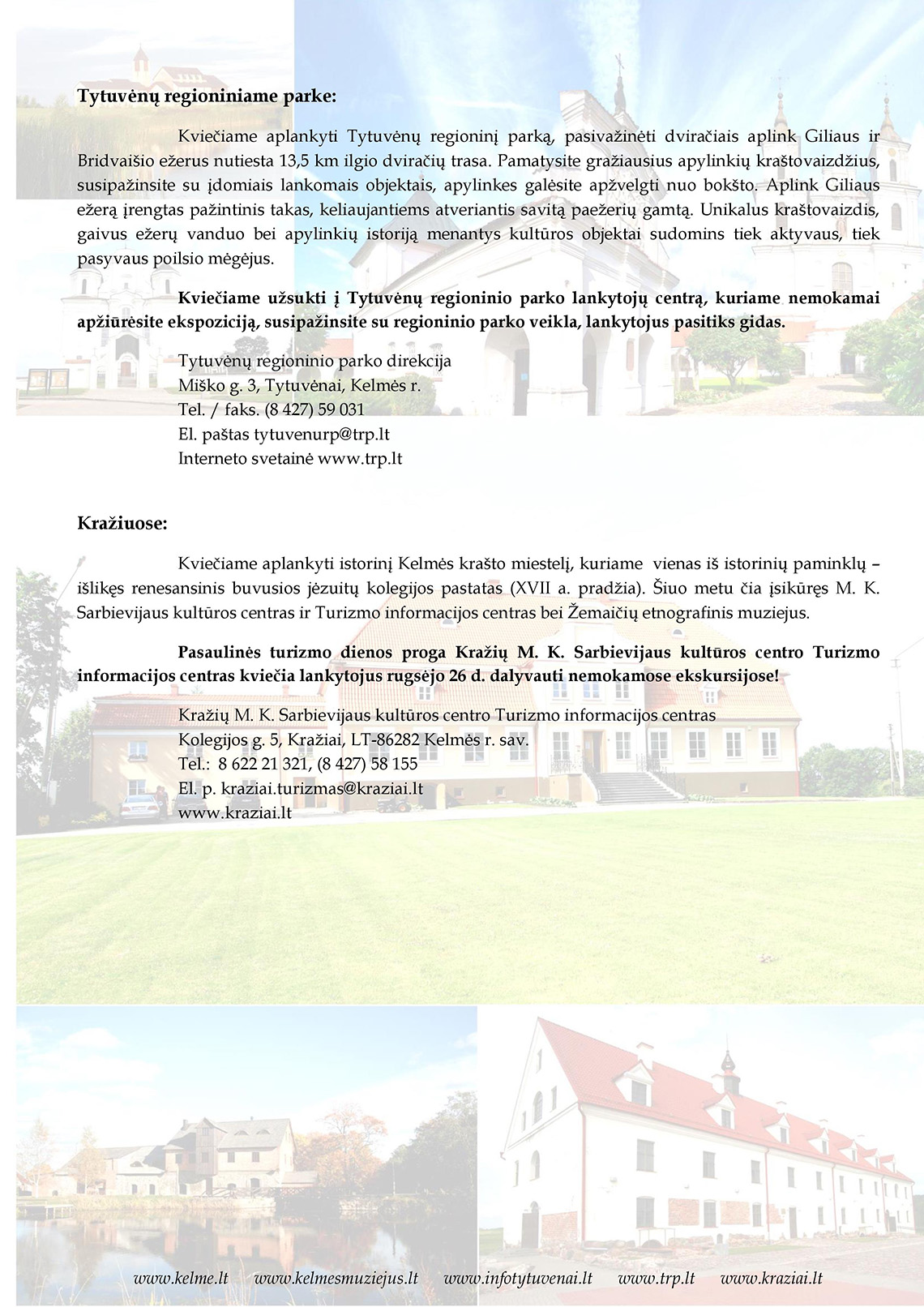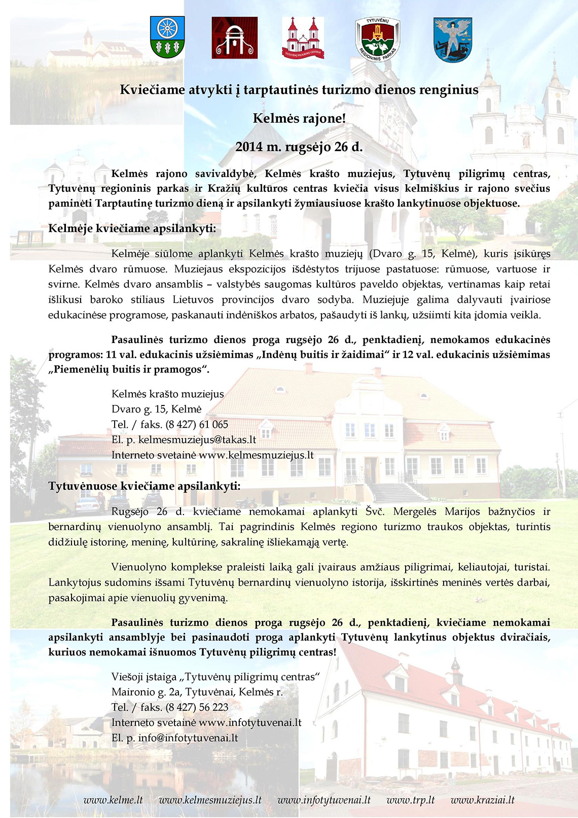 Kelmės rajono savivaldybė, Kelmės krašto muziejus, Tytuvėnų piligrimų centras, Tytuvėnų regioninis parkas ir Kražių kultūros centras kviečia visus kelmiškius ir rajono svečius paminėti Tarptautinę turizmo dieną ir apsilankyti žymiausiuose krašto lankytinuose objektuose rugsėjo 26 d.