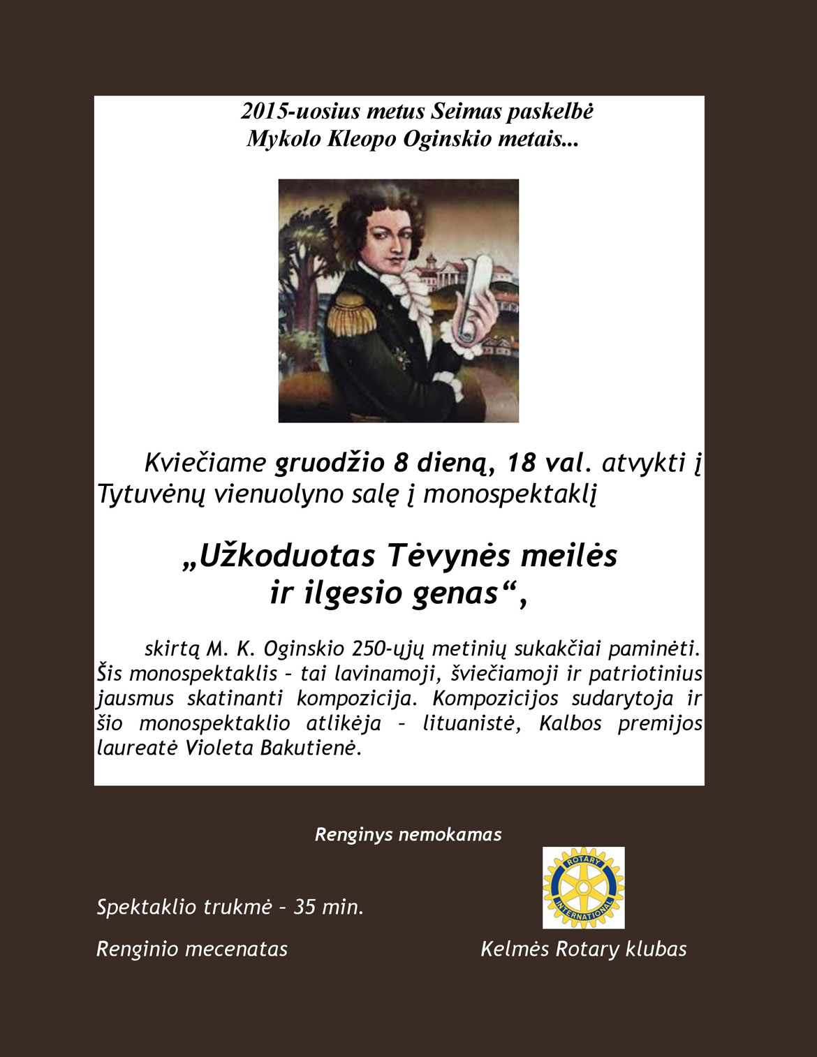 Visus kviečiame į nemokamą renginį "Užkoduotas Tėvynės meilės ir ilgesio genas". Lauksime Jūsų Tytuvėnų vienuolyno refektorinėje salėje, š.m. gruodžio 8 d. 18 val.. Renginį Jums dovanoja Kelmės Rotary klubas.
