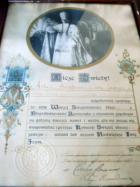 Popiežiaus Pijaus XI apaštalinis palaiminimas Antanui Mikutavičiui jo žmonai Jadvygai ir dukrai Liucijai. Palaiminimas- pergamentinis pažymėjimas su Popiežiaus atvaizdu, antspauduotas Pontifiko antspaudu patvirtintas parašu, surašytas Vatikane 1933 metais.
