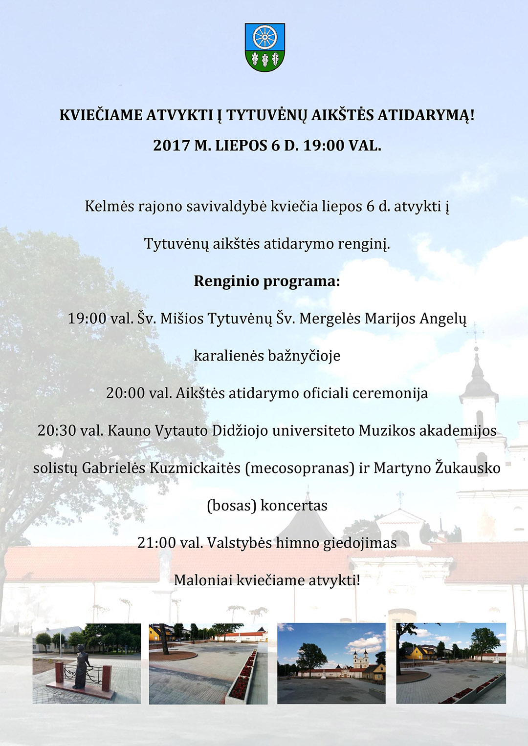 Kelmės r. savivaldybė kviečia liepos 6 d. atvykti į Tytuvėnų aikštės atidarymo renginį.