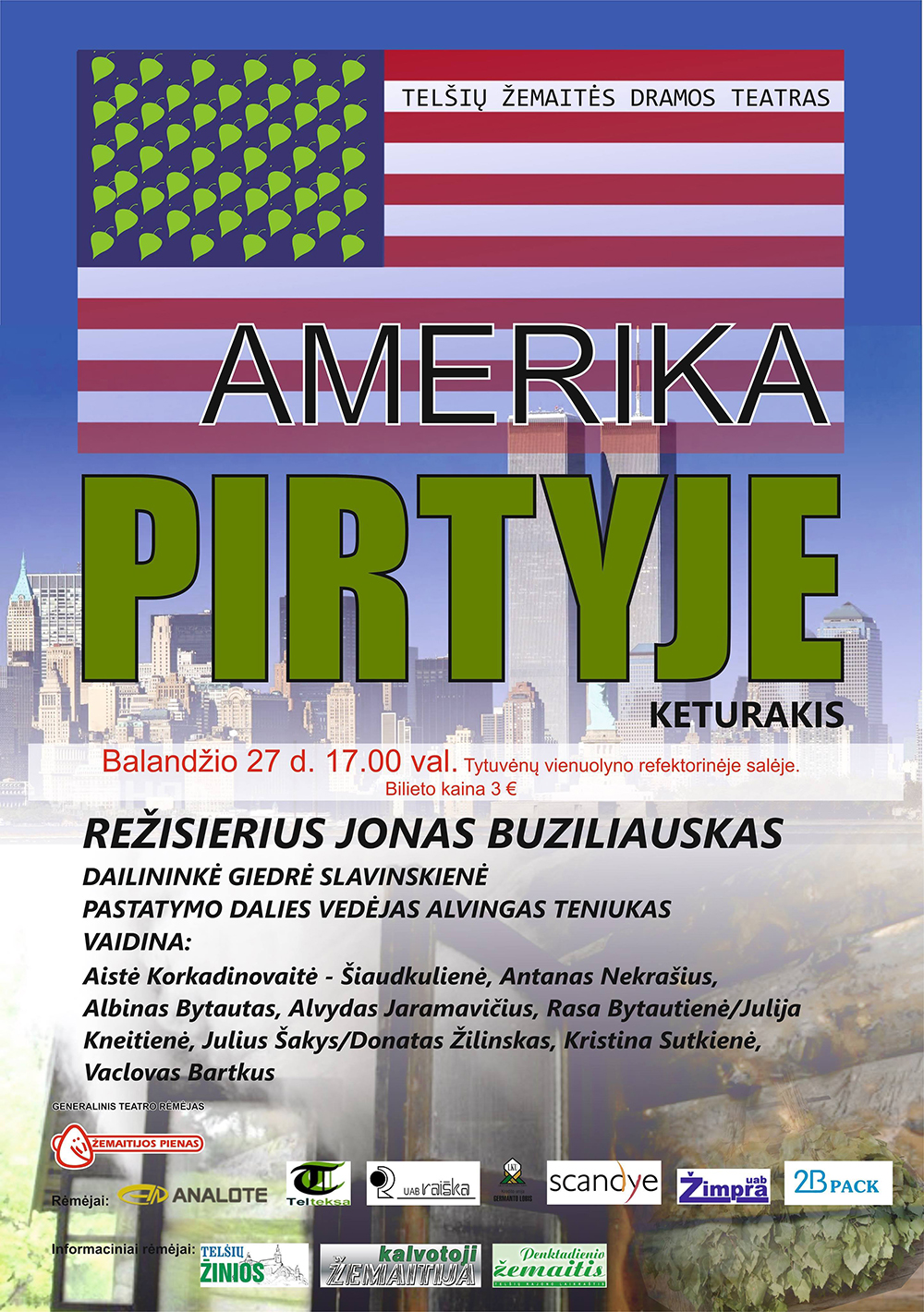 Kviečiame visus š.m. balandžio 27 d. 17 valandą į spektaklį Amerika pirtyje, kuris vyks Tytuvėnų vienuolyno refektorinėje salėje.