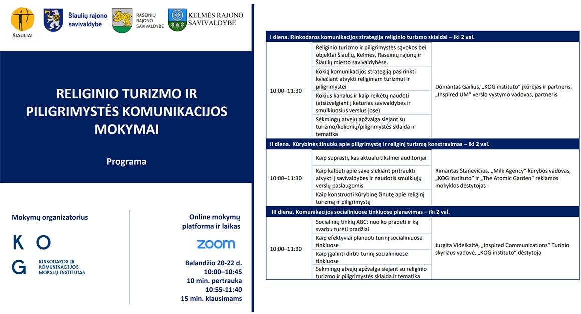 Piligrimystės ir religinio turizmo komunikacijos mokymų tikslas – suteikti žinių ir įgūdžių, kaip pristatyti savo atstovaujamą sritį (lankytiną objektą, kavinę, apgyvendinimo įstaigą ar svečių namus, kt.) ir pakviesti joje apsilankyti piligrimus bei besidominančius religiniu turizmu. Mokymus organizuoja KOG rinkodaros ir komunikacijos mokslų institutas, mokymai vyks nuotoliniu būdu „Zoom“ platformoje.