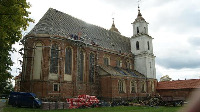 Šiuo metu sutvirtintos stogo konstrukcijos, atliekami stogo skardinimo darbai, pasiruošta čerpių dėjimui. Šią savaitę parvežtas restauruotas bažnyčios stogo kryžius.