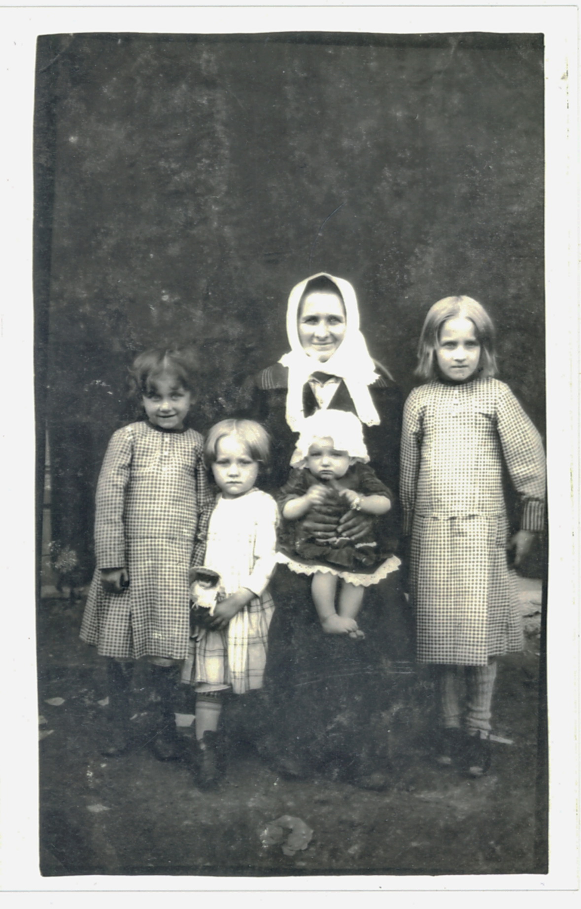Marcelė Radzevičienė su dukromis: Aleksandra (ant kelių), Veronika (fotografo kairėje, glaudžiasi), Karolina (pirmoji iš kairės), Elena (pirmoji iš dešinės). (Nuotrauka iš Radzevičių šeimos archyvo)
