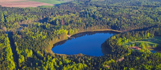 Miškų apsuptas, ramus ežerėlis, kuriame atsispindi aplink tankiai suaugę medžiai.